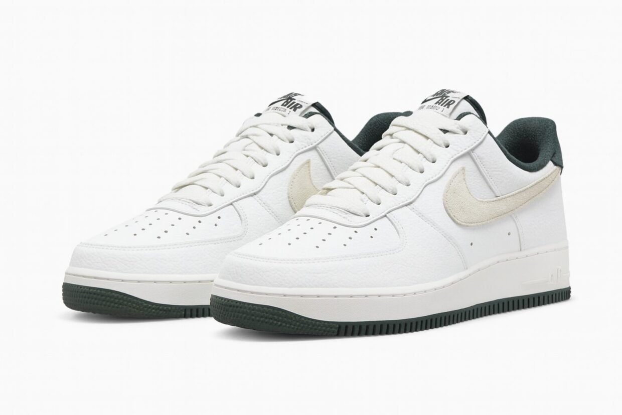 Iconic Nike Air Force 1 with a white leather upper and beige swooshes—clean, classic, and versatile.