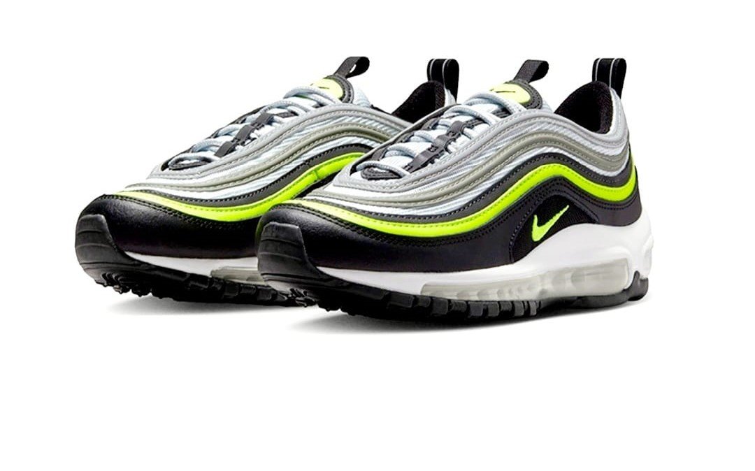 Bold Nike Air Max 97 in black, grey, and neon green with full-length air cushioning and reflective waves.
